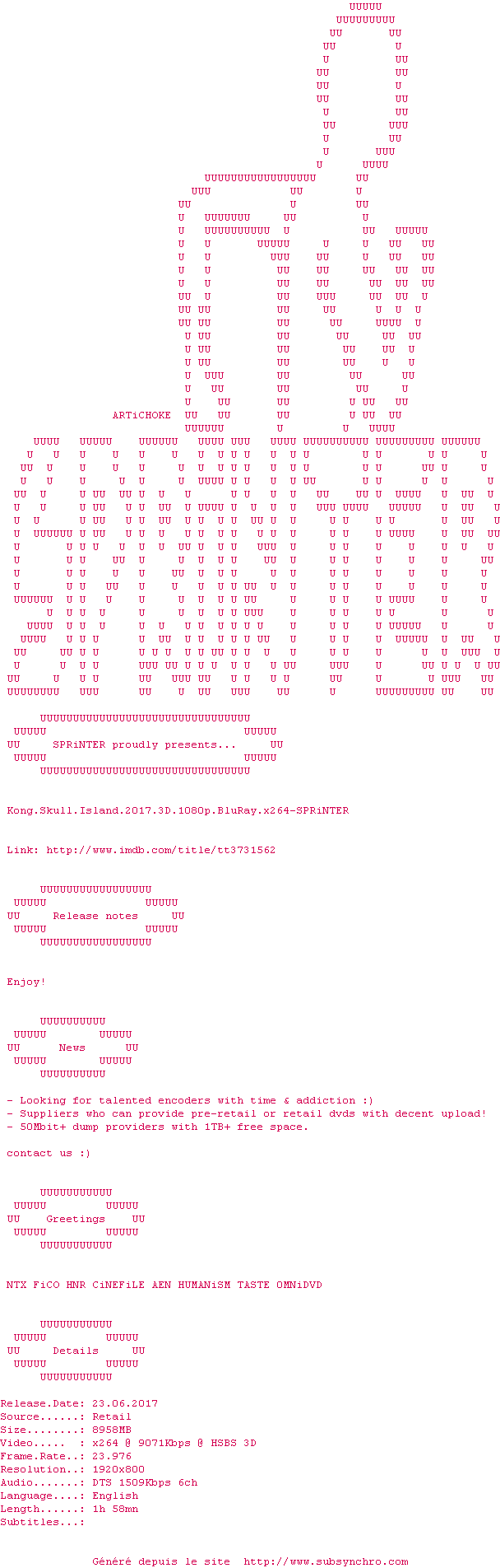 Le commentaire de nuagesept Commente par nuagesept (242), Le Mardi 11 Avril 2017 à 09h24 un film de monstres, point barre, c'est bien fait ça défoule mais c'est complètement creux et ça pompe un max sur le king kong de Peter Jackson, pas de surprise. 5 / 10 5 1
