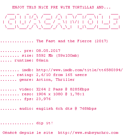 Voir le nfo de la release The.Fast.And.The.Fierce.2017.1080p.BluRay.x264-GUACAMOLE