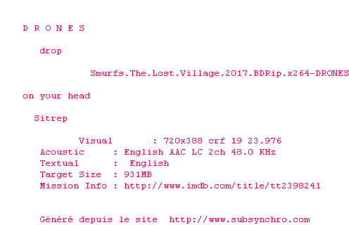 Voir le nfo de la release Smurfs.The.Lost.Village.2017.BDRip.x264-DRONES