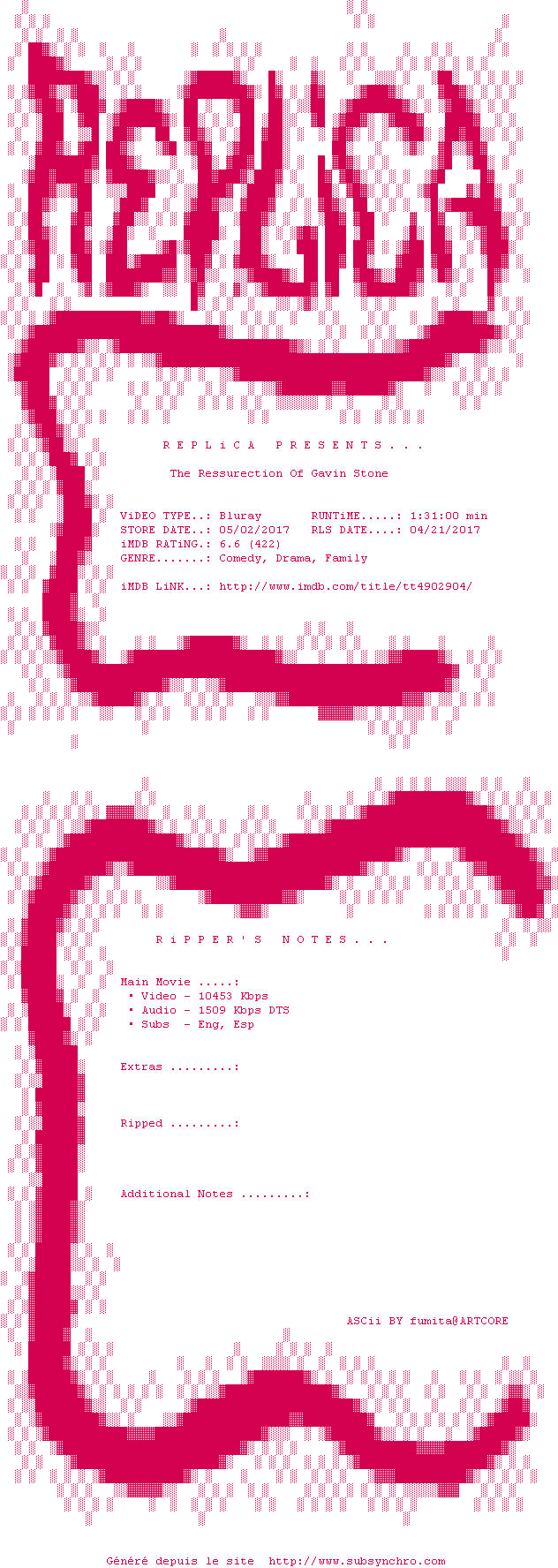Voir le nfo de la release The.Resurrection.Of.Gavin.Stone.2016.1080p.BluRay.x264-Replica