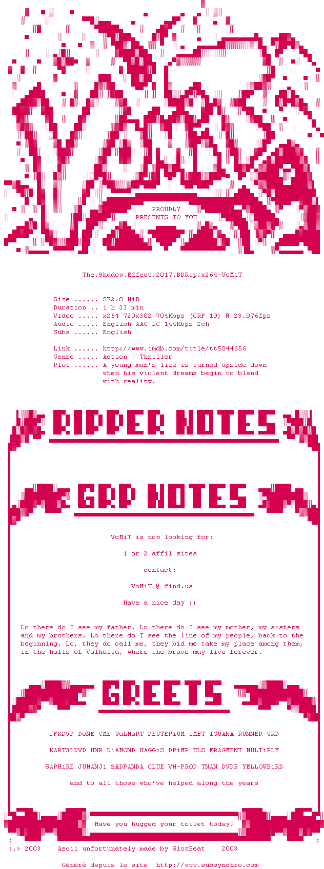 Voir le nfo de la release The.Shadow.Effect.2017.BDRip.x264-VoMiT