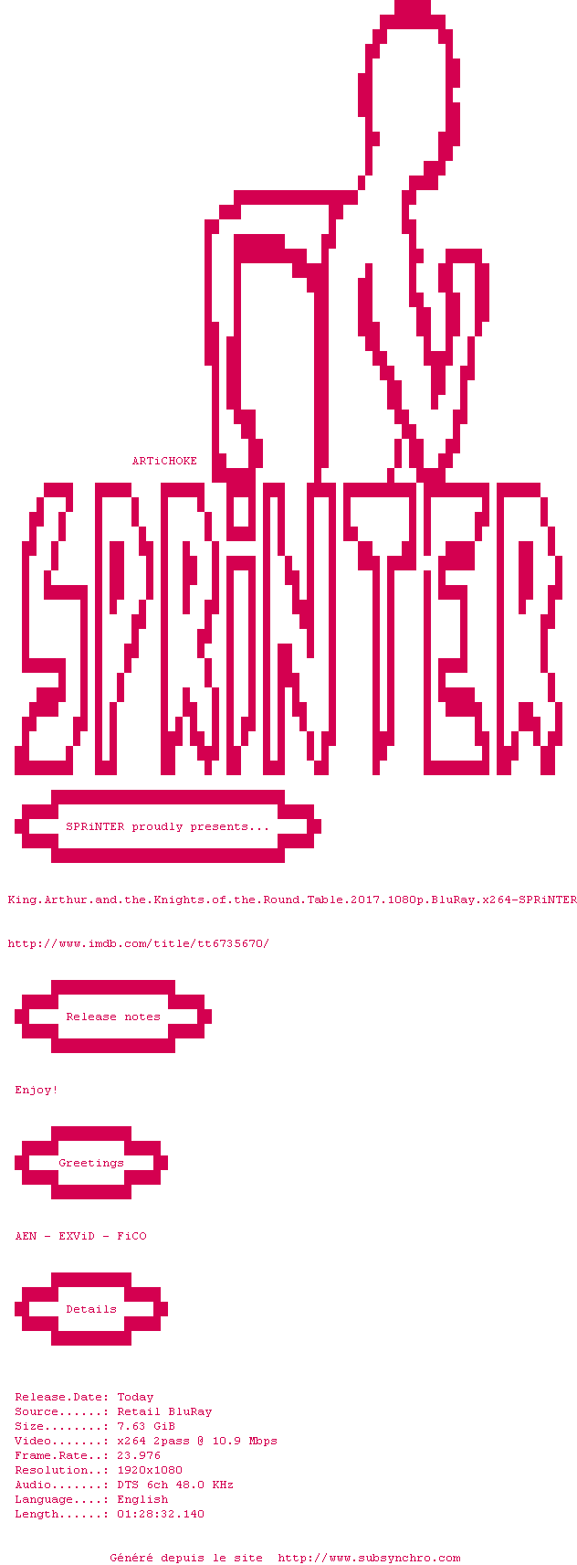 Voir le nfo de la release King.Arthur.And.The.Knights.Of.The.Round.Table.2017.720p.BluRay.x264-SPRiNTER