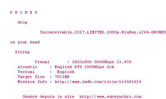Voir le nfo de la release Inconceivable.2017.LIMITED.1080p.BluRay.x264-DRONES