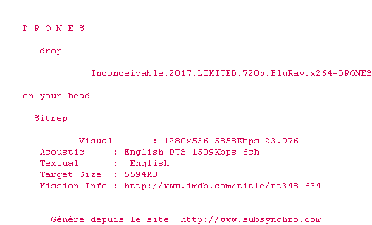 Voir le nfo de la release Inconceivable.2017.LIMITED.720p.BluRay.x264-DRONES