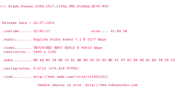 Le commentaire de heyjoe Commente par heyjoe (6), Le Vendredi 05 Janvier 2018 à 23h39 Ce film résonne encore dans ma tête. Les plans sont juste magnifiques, l'ambiance, le rythme, c'est un vrai plongeon dans le Blade Runner de 82 surpassé par un degré de détails que je n'avais encore jamais vu. Villeneuve avait le budget qui fallait, on peut dire qu'il n'a pas été avare pour montrer l'étendu de son talent. J'aurais presque aimé que le film dure 2 heures de plus pour prolonger mon immersion. 9 / 10 0 0