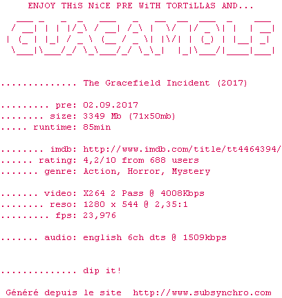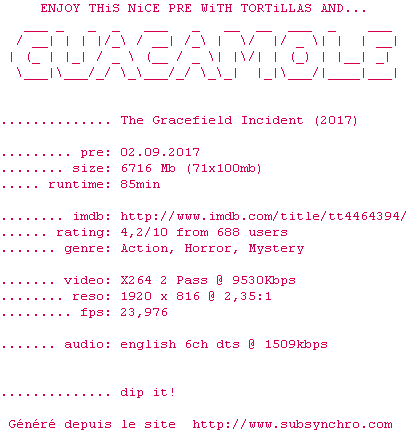 Voir le nfo de la release The.Gracefield.Incident.2017.720p.BluRay.x264-GUACAMOLE