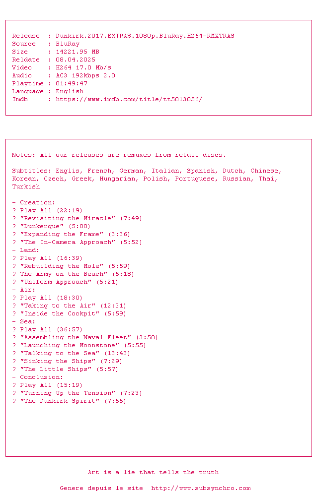 Voir le nfo de la release Dunkirk.2017.EXTRAS.1080p.BluRay.H264-RMXTRAS