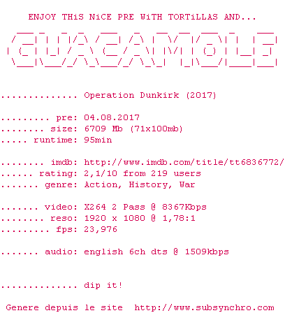 Voir le nfo de la release Dunkirk.2017.COMPLETE.FR.BLURAY-4FR