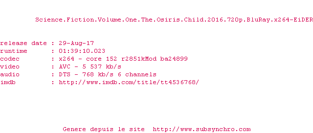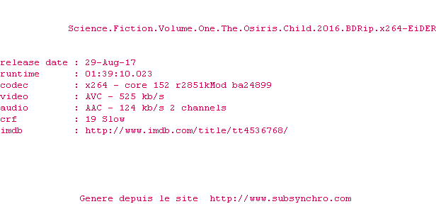 Le commentaire de Yaumegui Commente par Yaumegui (569), Le Jeudi 28 Septembre 2017 à 21h39 Ce n'est pas excellent, mais loin d'être mauvais. La fin peut surprendre. Un vod de qualité pour fan de sf comme moi. 6 / 10 0 0