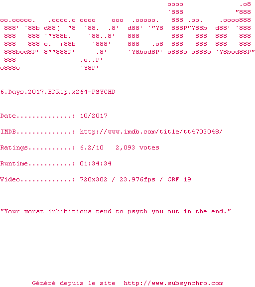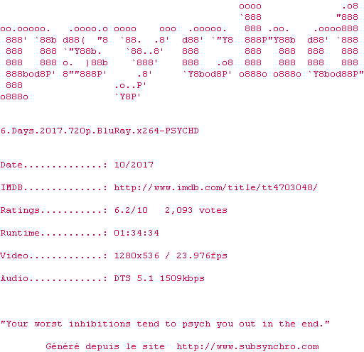 | Voir le nfo de la release 6.Days.2017.BDRip.x264-PSYCHD | PSYCHD | 6.Days.2017.BDRip.x264-PSYCHD OpenSubtitles | 0 fichier | ||