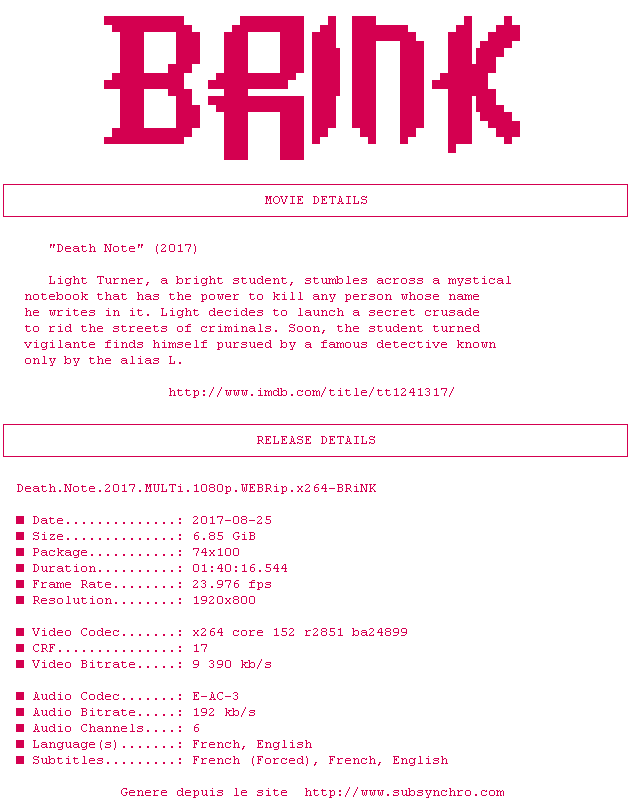 Y avez-vous pense ? Nous proposons déjà 5 sous-titres pour le film Death Note. Avez-vous essaye de voir si ces sous-titres etaient compatibles avec cette release ? On vous laisse le soin de tester cela pour nous et de contribuer au site en postant le sous-titre en cas de compatiblite constatee !