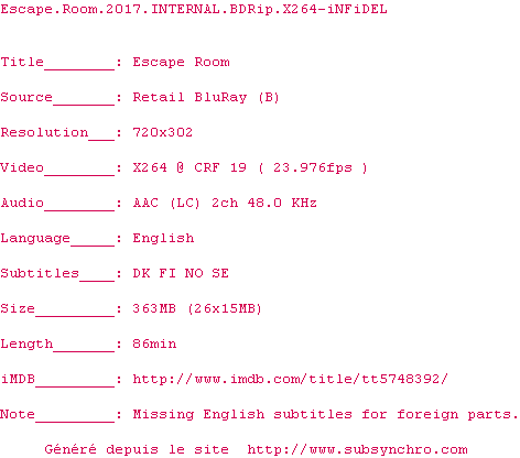 Voir le nfo de la release Escape.Room.2017.iNTERNAL.BDRip.x264-iNFiDEL