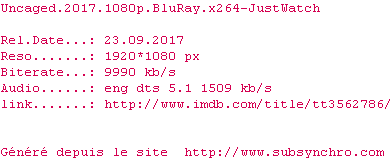 | Voir le nfo de la release Uncaged.2017.1080p.BluRay.x264-JustWatch | JustWatch | Uncaged.2017.1080p.BluRay.x264-JustWatch OpenSubtitles | 0 fichier | ||