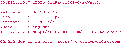 Voir le nfo de la release 68.Kill.2017.BDRip.x264-JustWatch