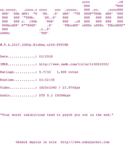 Voir le nfo de la release M.F.A.2017.1080p.BluRay.x264-PSYCHD