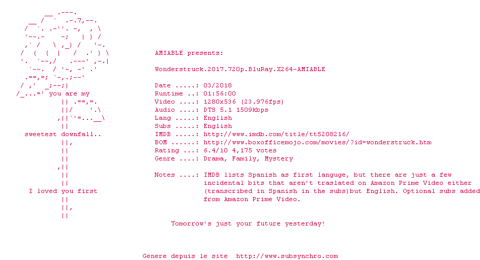 Voir le nfo de la release Wonderstruck.2017.1080p.BluRay.x264-AMIABLE