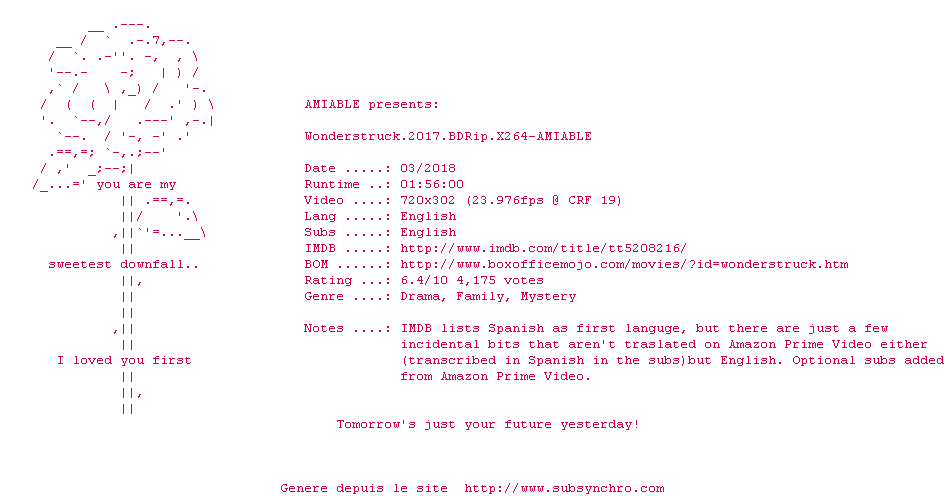 Voir le nfo de la release Wonderstruck.2017.BDRip.x264-AMIABLE