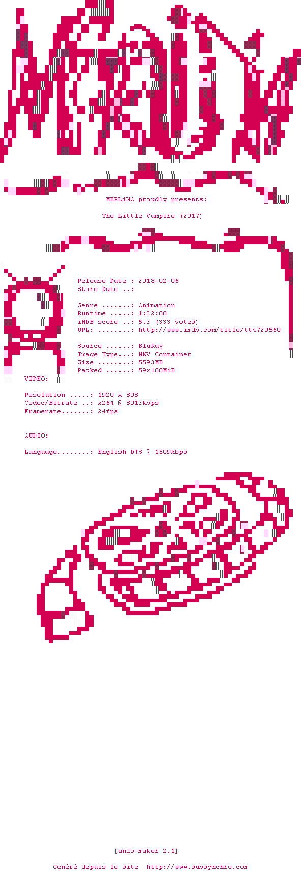 Voir le nfo de la release The.Little.Vampire.2017.1080p.BluRay.x264-MERLiNA
