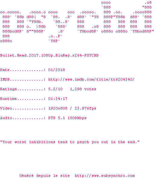 Voir le nfo de la release Bullet.Head.2017.1080p.BluRay.x264-PSYCHD