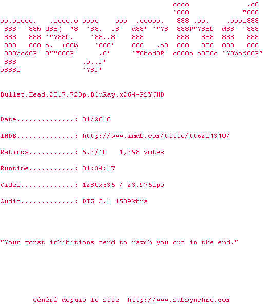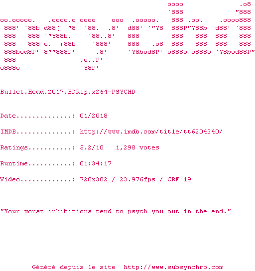 Voir le nfo de la release Bullet.Head.2017.720p.BluRay.x264-PSYCHD