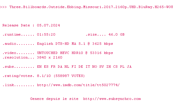 Le commentaire de buches1 Commente par buches1 (143), Le Vendredi 16 Fevrier 2018 à 21h37 Très dur de faire une critique sur ce film, si ce n'est de parler de toutes ses qualités. Photo excellente, narration excellente, interprétation excellente, sujets très dur mais menés avec beaucoup de finesse (colère, désarroi, justice). C'est le genre de film qui vous coupe un peu la parole et fait travailler votre cerveau tant ses sujets sont emprunt de vrai reflexion que l'auteur vous laisse tout simplement vivre par vous-même. 8 / 10 Le commentaire de Elric De Melniboné Commente par Elric De Melniboné (121), Le Samedi 17 Fevrier 2018 à 14h42 Interprétation Excellente? les personnages sont tellement caricaturaux que cela en est grotesque. Il n'y a que Woody me rattraper le tout. Et le coup du shérif adjoint à qui on ne demande que son badge et son flingue après ce qu'il a fait... Ridicule. Le commentaire de buches1 Commente par buches1 (143), Le Dimanche 18 Fevrier 2018 à 00h06 C'est surement pour leur mauvais jeux que deux d'entre eux ont été nommé pour des Oscars d’interprétation, ou encore que le film est nommé pour le meilleur film ou scénario original... Le commentaire de Elric De Melniboné Commente par Elric De Melniboné (121), Le Dimanche 18 Fevrier 2018 à 18h27 Ahhh... C'est les Oscars donc ils ont forcément raison... 0 0 0 0 0 2 1 1