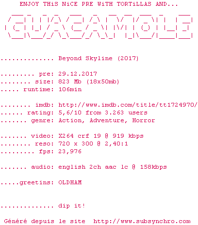 Voir le nfo de la release Beyond.Skyline.2017.720p.BluRay.x264-GUACAMOLE