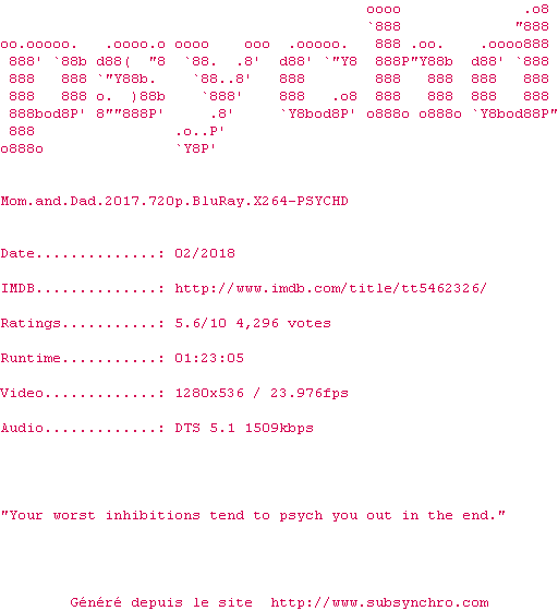 Voir le nfo de la release Mom.And.Dad.2017.720p.BluRay.x264-PSYCHD