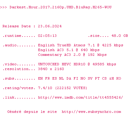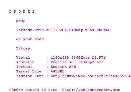 Le commentaire de buches1 Commente par buches1 (57), Le Jeudi 15 Fevrier 2018 à 10h52 Excellent film, parfaitement narré, parfaitement joué, Oldman est totalement méconnaissable! Et en plus le laps historique raconté va parfaitement avec le Dunkerk de Nolan! Après tout ces films sur Churchill et sur cette période de l'histoire (anglaise), il n'en manque plus qu'un sur Churchill et le Blitz. Bref, très rythmé, bien filmé et plaisant à voir ! 8.5 / 10 0 0
