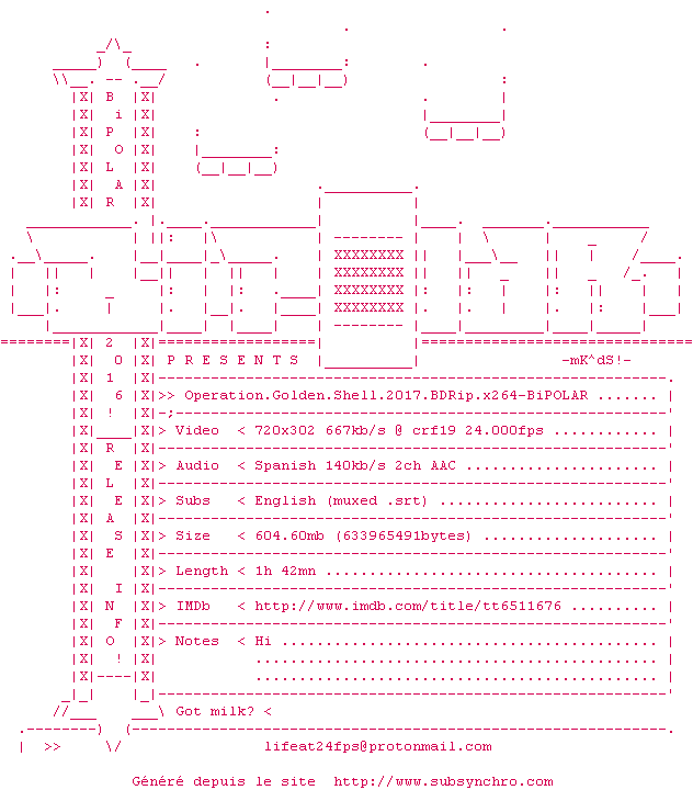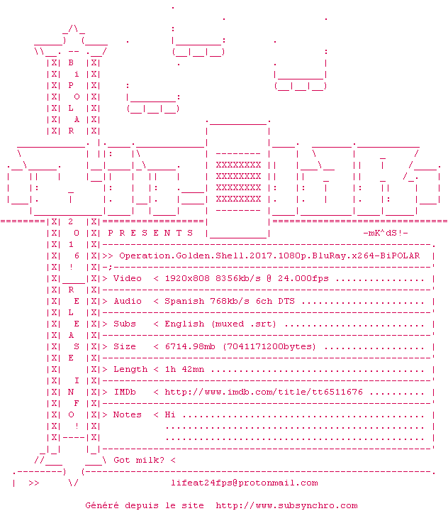 Voir le nfo de la release Operation.Golden.Shell.2017.720p.BluRay.x264-BiPOLAR