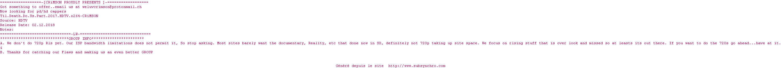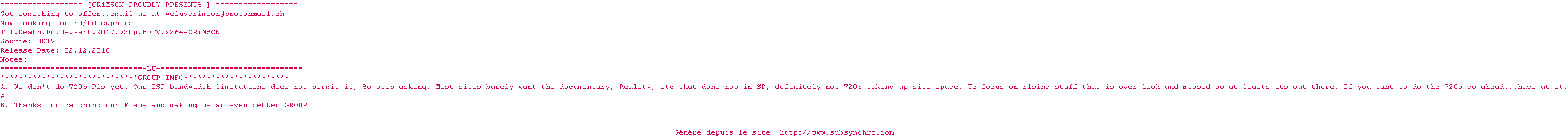 Voir le nfo de la release Til.Death.Do.Us.Part.2017.720p.HDTV.x264-CRiMSON