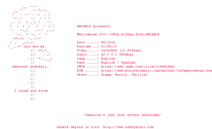 Voir le nfo de la release Marrowbone.2017.1080p.BluRay.x264-AMIABLE