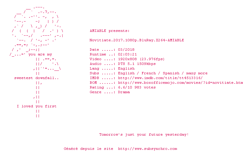 Voir le nfo de la release Novitiate.2017.1080p.BluRay.x264-AMIABLE