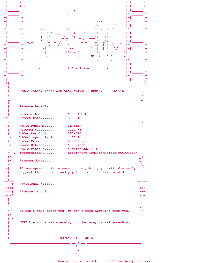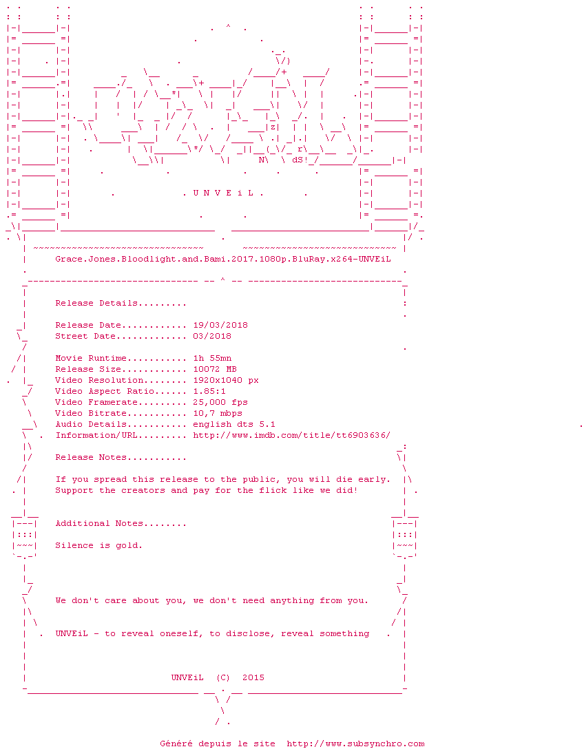 Voir le nfo de la release Grace.Jones.Bloodlight.And.Bami.2017.1080p.BluRay.x264-UNVEiL