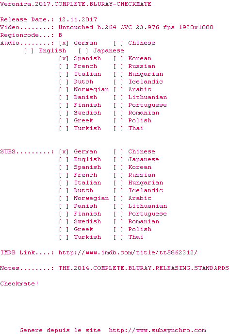 Y avez-vous pense ? Nous proposons déjà 1098 sous-titres pour le film Veronica. Avez-vous essaye de voir si ces sous-titres etaient compatibles avec cette release ? On vous laisse le soin de tester cela pour nous et de contribuer au site en postant le sous-titre en cas de compatiblite constatee !