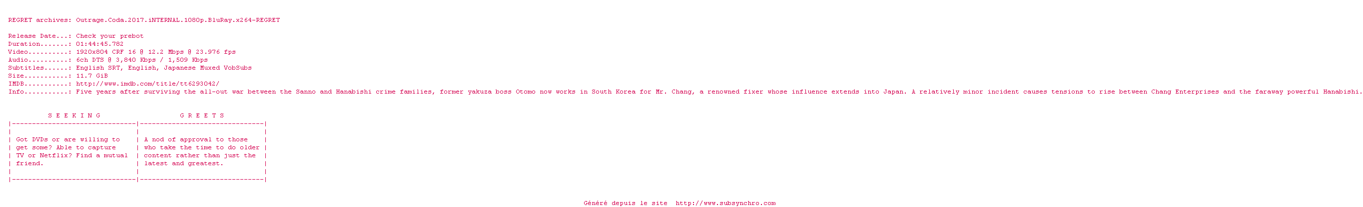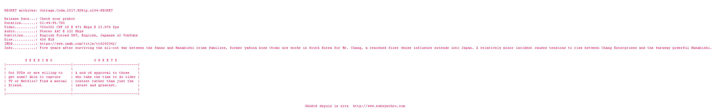 Voir le nfo de la release Outrage.Coda.2017.BDRip.x264-REGRET