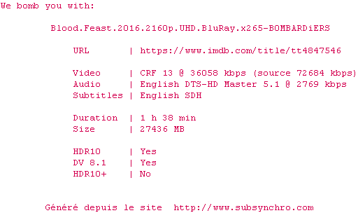 Voir le nfo de la release Blood.Feast.2016.2160p.UHD.BluRay.x265-B0MBARDiERS