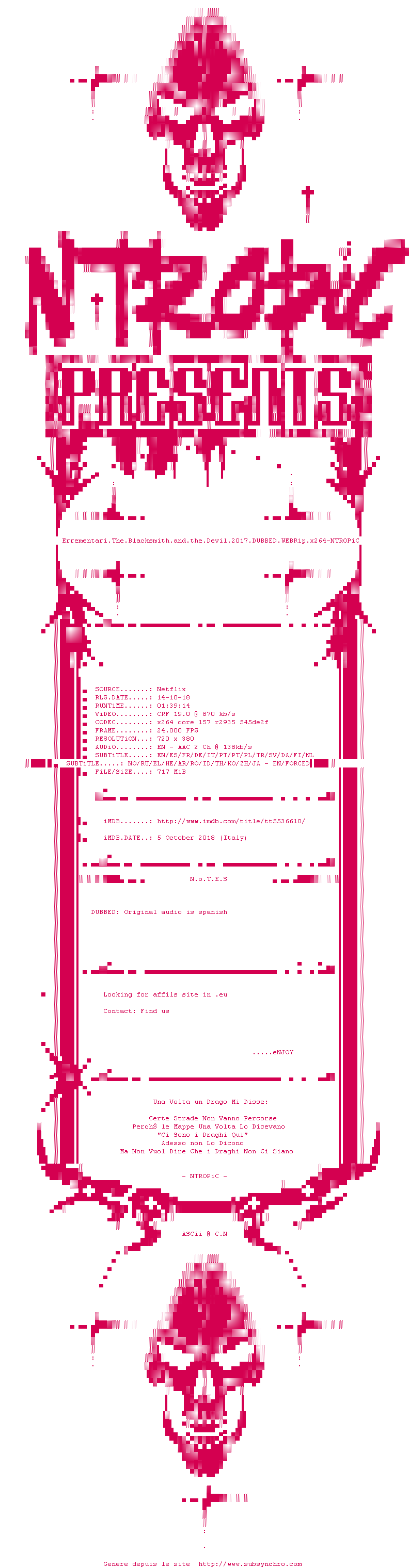Voir le nfo de la release Errementari.The.Blacksmith.And.The.Devil.2017.DUBBED.720p.WEBRip.x264-NTROPiC
