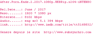 Voir le nfo de la release After.Porn.Ends.2.2017.1080p.WEBRip.x264-iNTENSO