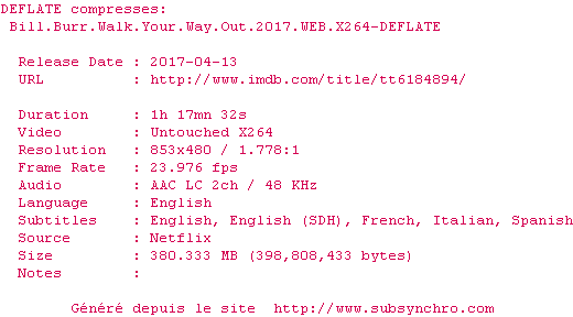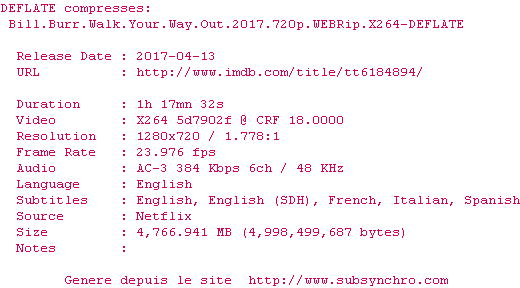 Voir le nfo de la release Bill.Burr.Walk.Your.Way.Out.2017.1080p.WEBRip.x264-DEFLATE