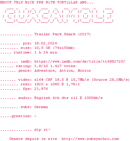 Telechargez le RSS « Fichier de la release Trailer.Park.Shark.2017.1080p.BluRay.x264-GUACAMOLE »
