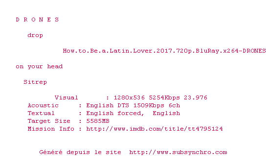 Telechargez le RSS « Fichier de la release How.To.Be.A.Latin.Lover.2017.720p.BluRay.x264-DRONES »