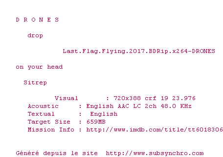 Telechargez le RSS « Fichier de la release Last.Flag.Flying.2017.BDRip.x264-DRONES »