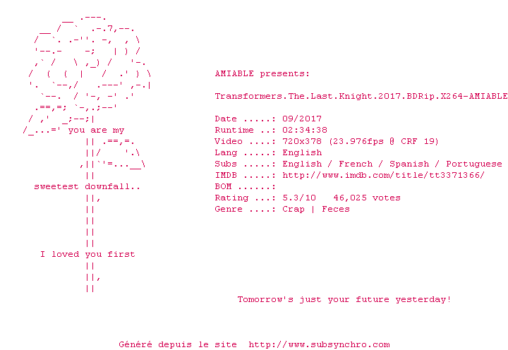 Telechargez le RSS « Fichier de la release Transformers.The.Last.Knight.2017.BDRip.x264-AMIABLE »