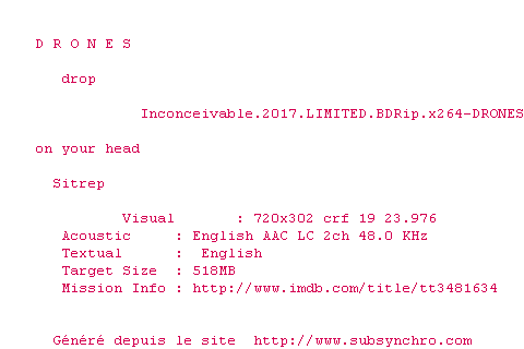 Telechargez le RSS « Fichier de la release Inconceivable.2017.LIMITED.BDRip.x264-DRONES »