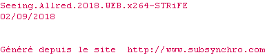 | STRiFE | Seeing.Allred.2018.1080p.WEB.x264-STRiFE OpenSubtitles | 0 fichier | |||