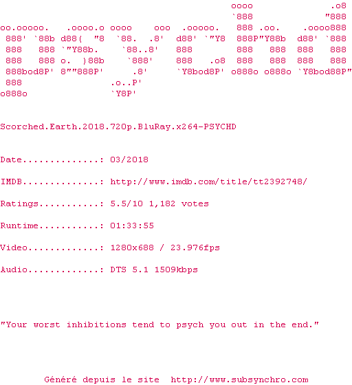 Voir le nfo de la release Scorched.Earth.2018.1080p.BluRay.x264-PSYCHD