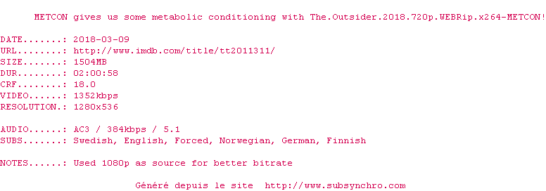 | Voir le nfo de la release The.Outsider.2018.720p.WEBRip.x264-METCON | METCON | The.Outsider.2018.720p.WEBRip.x264-METCON OpenSubtitles | 0 fichier | ||