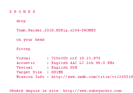 Le commentaire de monsieur jo Commente par monsieur jo (41), Le Mercredi 24 Octobre 2018 à 11h23 Dès le départ on oublie le 90 D, lèvres pulpeuses et la mono expressivité de l'ex Larangelina Joliecroft. On accroche tout de suite à la vivacité et la robustesse de notre pétillante, jeune et sportive Lara Croft cru 2018. Alors le scénario ne casse pas 3 pattes à un cafard, on passe les quelques plans ou fx un peu douteux. On se laisse prendre au jeu et finalement on se dit que l'on a passé un bon moment devant un bon" ptit" Benjamin Gates version féminine. Fidèle au nouveau jeu vidéo en plus. À découvrir Ça mérite une suite mais plus d'excuses cette fois là ! 6.5 / 10 0 0