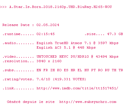 Le commentaire de buches1 Commente par buches1 (139), Le Samedi 02 Fevrier 2019 à 13h41 Ce n'est pas le genre de film que je m'attendais à voir et dans l'ensemble je ne suis pas vraiment conquis. Pour commencer je trouve que l'histoire ne trouve pas le bon ton dans sa narration et se cherche beaucoup entre les deux axes de son histoire. La côté création de la star est assez superficiel et on ne vit pas cette ascension fulgurante et l’émotionnel reste donc au placard. Puis, le côté descente aux enfers du country guy est quant à elle un mauvais ersatz des bios qui ont connu des grands succès (Ray, Walk the Line...)et est suffisament fade pour que l'impact soit insuffisant. Du coup aucun des deux n'est correctement exploité et le film est assez plat dans son ambiance, voir ennuyeux. Le jeu de Bradley est correct sans casser des briques, par contre Lady Gaga n'a dans son arsenal d'actrice que deux ou trois émotions, du coup elle ne m'a absolument pas convaincu en tant qu'actrice. Je trouve également que, et bien que cela soit de manière général bien filmé, les scènes sur la scène ne transmettent une fois encore pas assez d’émotion et du coup la musique ne traverse pas l'écran. Le scénario dans son ensemble manque de liant, et est trop souvent trop manichéen, sans être trop mauvais tout de même. Bref, je me suis ennuyée sur une grande partie du film alors que j'adore les films qui traitent de la musique. Cheers! 5.5 / 10 0 0