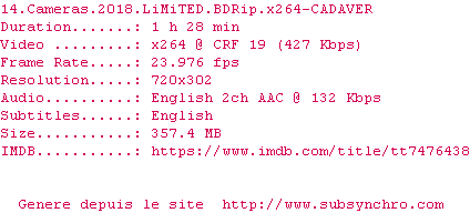 Voir le nfo de la release 14.Cameras.2018.LiMiTED.BDRip.x264-CADAVER